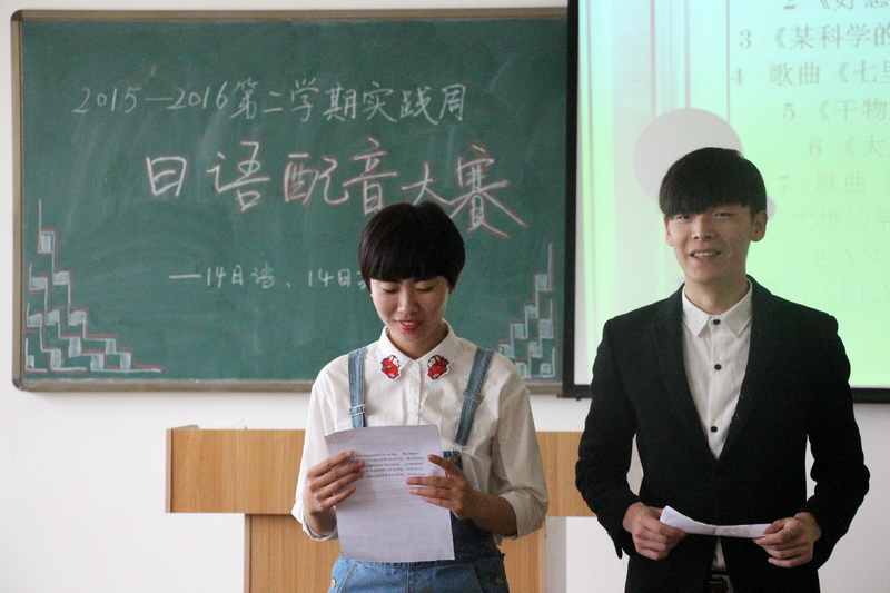 由日语教师现场打分,在每个班级分别选出二组比较好的小组,参加第二天的配音比赛。
