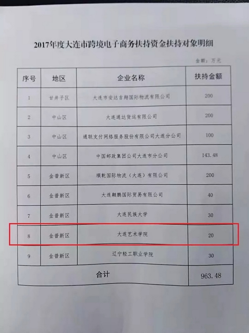 大艺beat365中文官方网站电子商务专业成功获批2017年度大连市跨境电商扶持资金项目,并取得20万元扶持资金,成为当年成功获批的9所单位中的唯一一所艺术类高校。